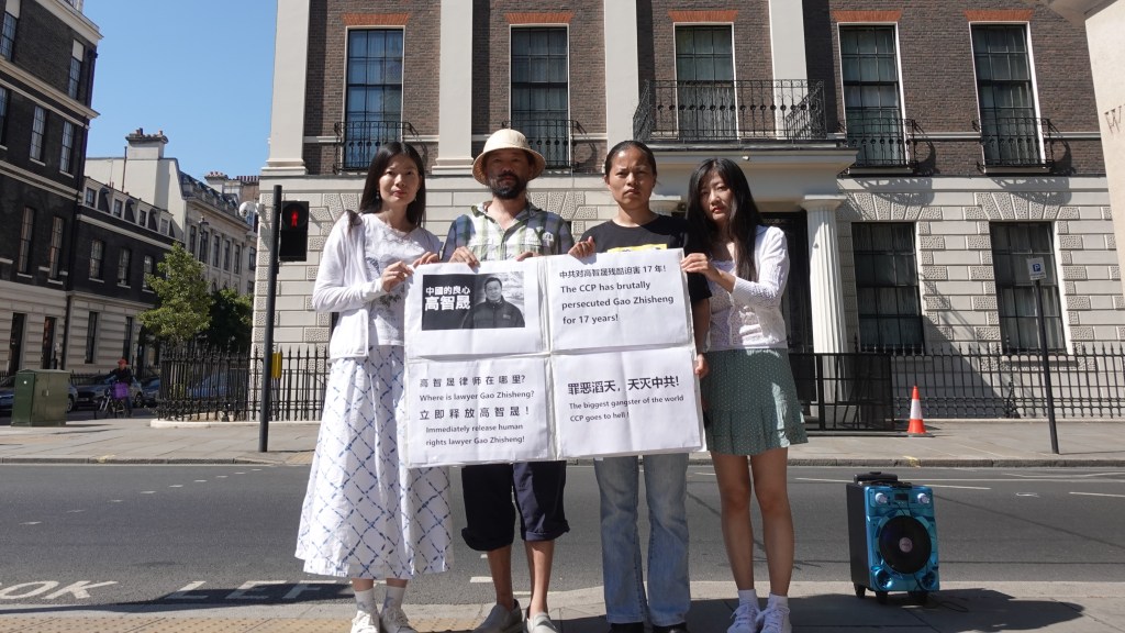 国际著名中国维权律师,被称为「中国的良心」「中国的脊粱」的高智晟律师,于2017年8月13日被中共非法抓捕,至今5年音讯全无。为此,中国民主党英国总部党员自发组织,前往伦敦中国大使馆举行抗议示威活动,强然谴责中共对高智晟律师的迫害,责成中共当局:立即释放高智晟律师。