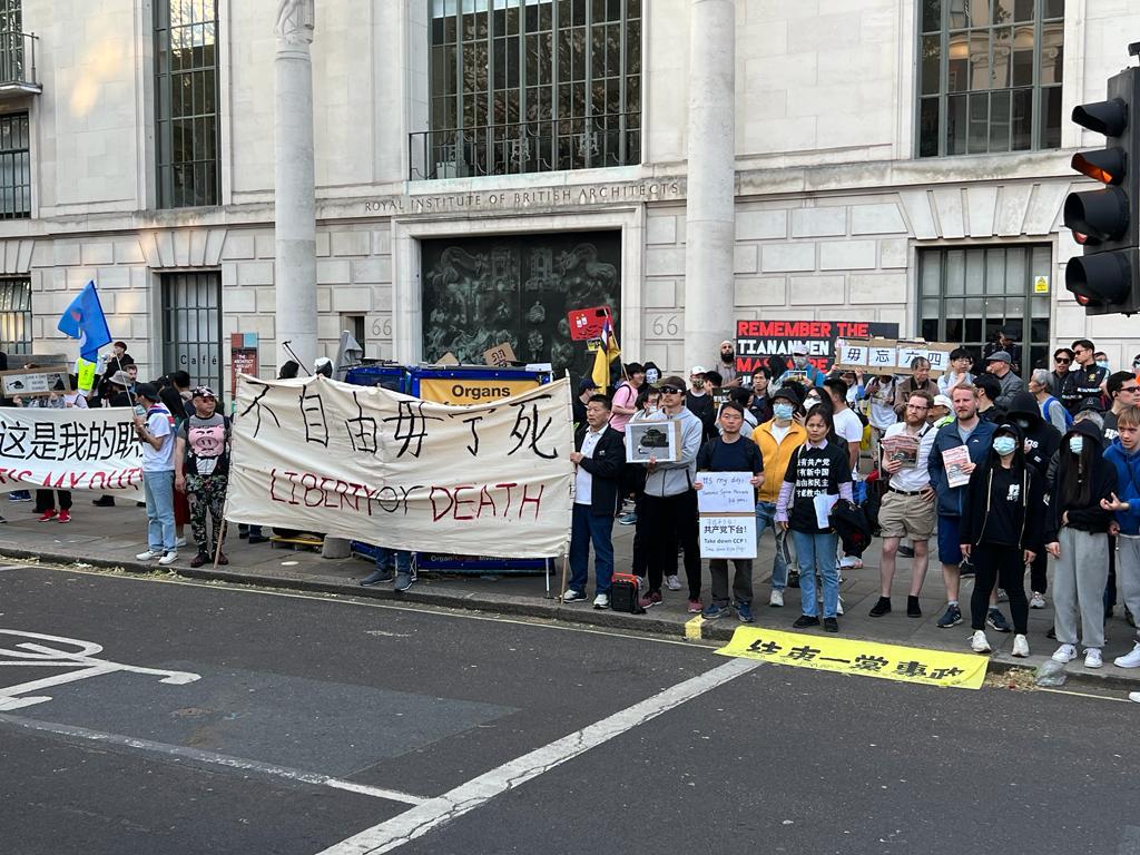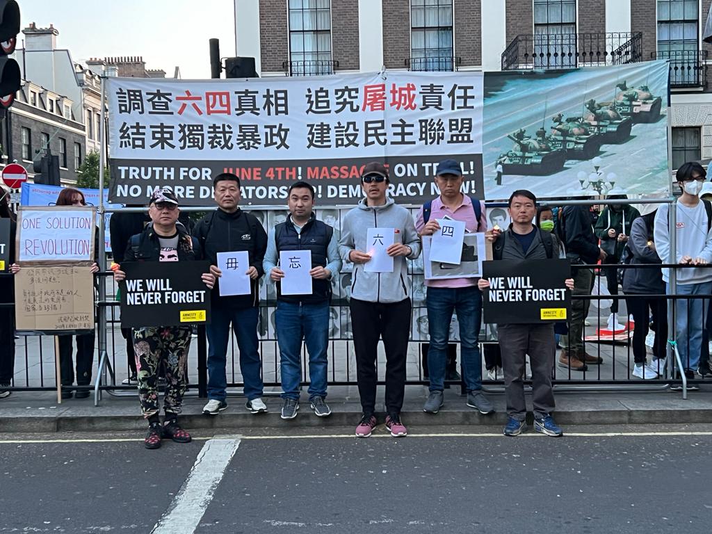 2023年6月4日是六四天安门大屠杀事件34周年纪念日,1989年6月4日,中国军队向民众开枪,用坦克镇压镇压,导致伤亡惨重。六四34周年之际,英国伦敦的示威游行抗议由中国留学生组成的“China Deviants”团体举办,中国民主党英国总部、港人、藏人、维吾尔人等人权组织和团体共同参与。