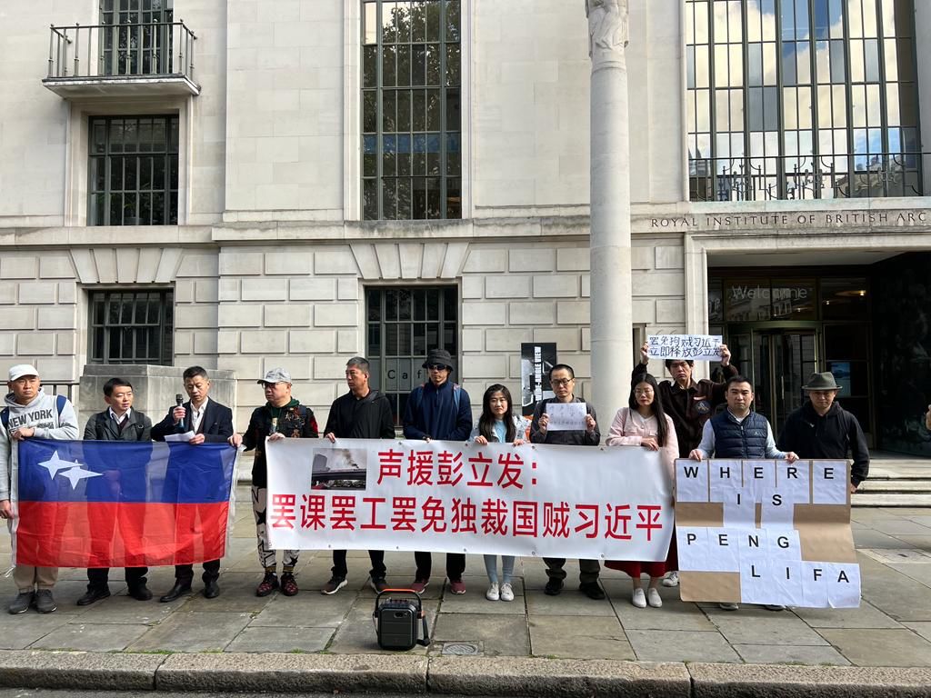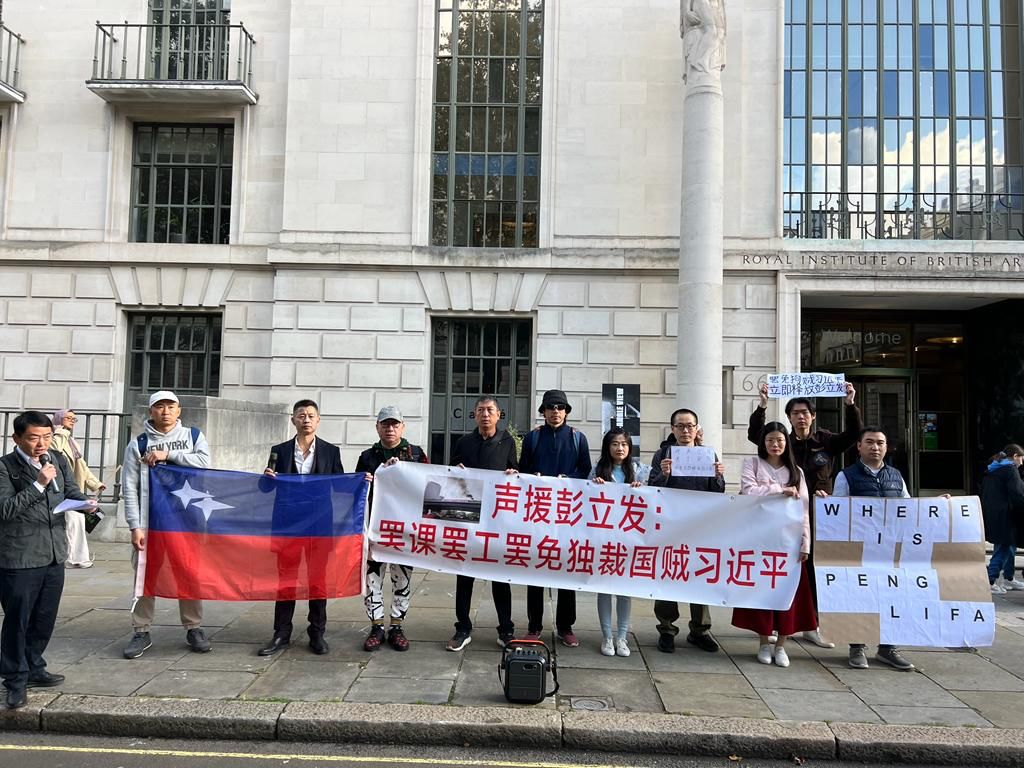 On October 14, 2023, the UK Headquarters of China Democracy Party held a protest demonstration in front of the Chinese Embassy in London. They raised the “Sìtōng Bridge” banner to show support for the “Lone Brave” Peng Lifa. The protest called for the immediate cessation of persecution against Peng Lifa’s family and the immediate release of Peng Lifa.