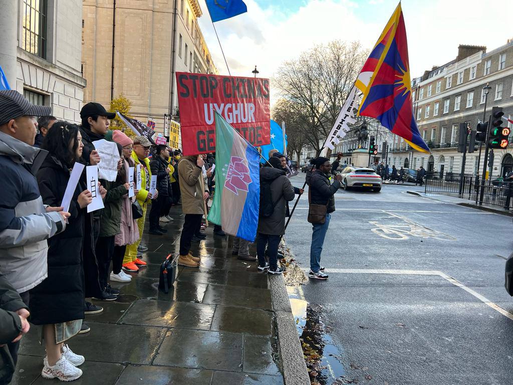 抗议活动在当日下午三时左右开始,来自不同背景的维吾尔人、西藏、香港、南蒙古等多个人权团体和中国民主党英国总部的成员齐聚一堂,手持标语和横幅,高呼着对人权状况的诉求。从言论自由到宗教信仰自由,再到少数群体权益等,展现了他们对多个人权问题的关切和支持,控诉着中国政府对人权广泛的侵害。伦敦警方在现场保持秩序,确保活动进行在和平和安全的氛围中。路人和媒体也纷纷聚集,对这场抗议活动表达出浓厚的兴趣和支持,美国之音对此次活动全程做了特别报道。
