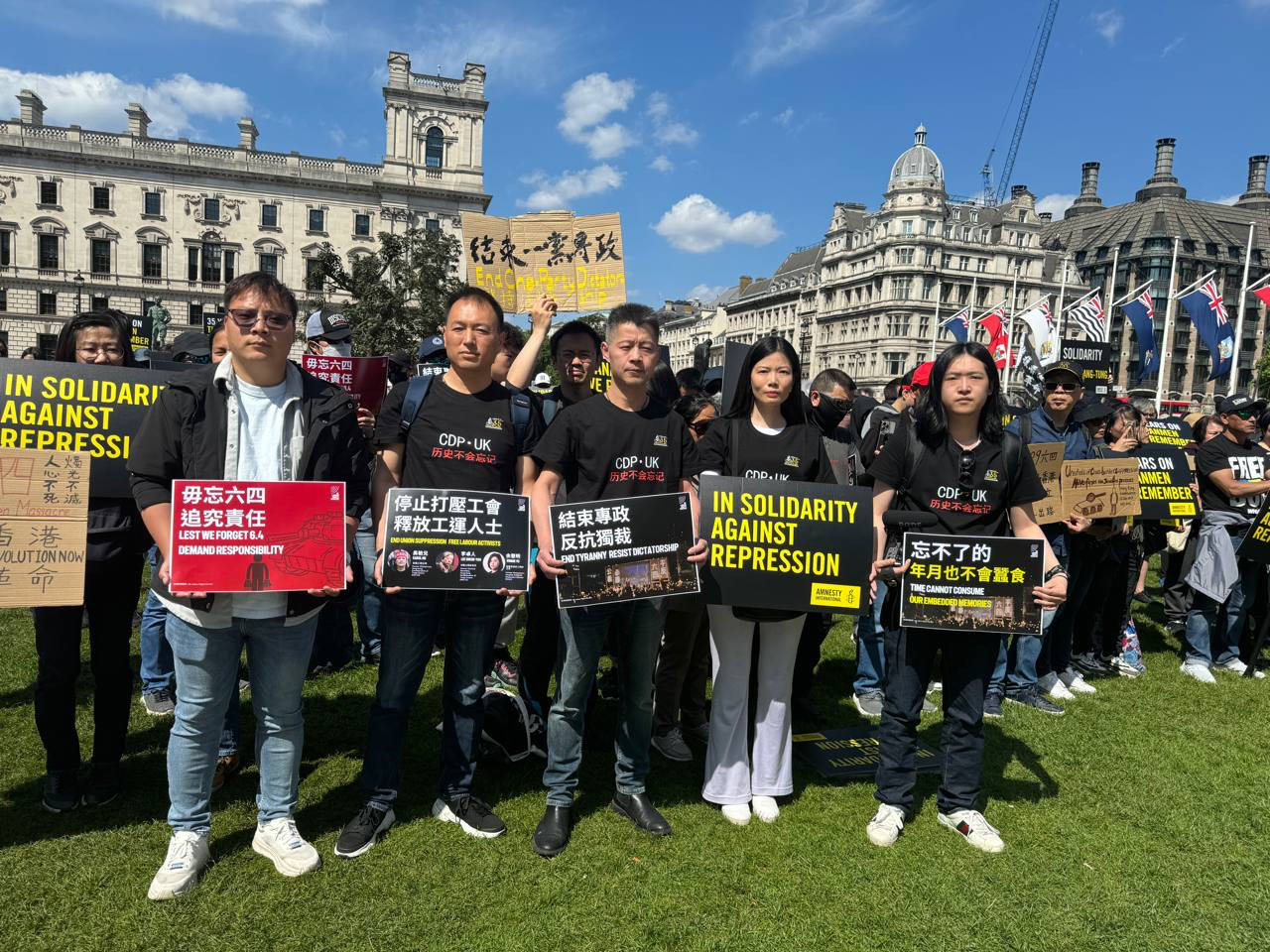At 2:30 PM on June 2, 2024, members of the UK Headquarters of the China Democracy Party arrived at Parliament Square in central London to participate in the grand commemoration of the 35th anniversary of June Fourth organized jointly by democratic parties in the UK, the CHINA DEVIANTS group, and Hong Kong exiles.