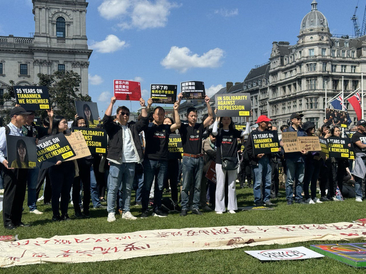 2024年6月2日下午2时30分,中国民主党英国总部党员们赶到位于伦敦市中心的英国议会广场,参加了由在英民主党派、CHINA DEVIANTS团体、香港流亡民众联合举办的声势浩大的六四35周年纪念活动。
