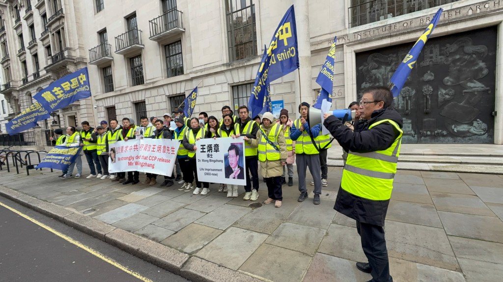 That day, London was gripped by biting cold winds under an overcast sky. More than 40 members and supporters of the UK Headquarters of China Democracy Party gathered across from the Chinese Embassy. Dressed in party vests, waving party flags, and holding red banners bearing the slogan “Strongly Demand the Chinese Government Release Dr Wang Bingzhang,” they expressed their demands with determination.