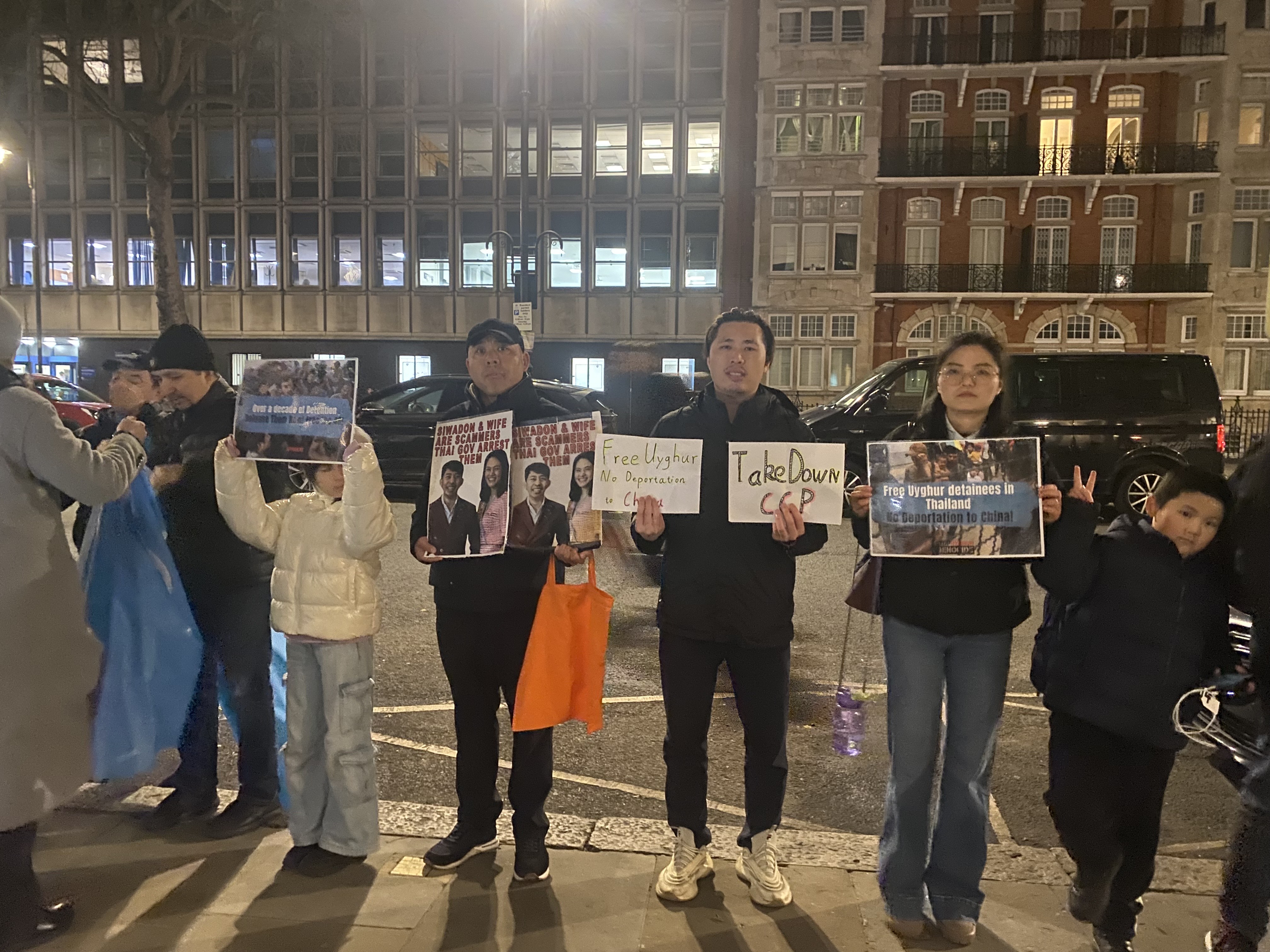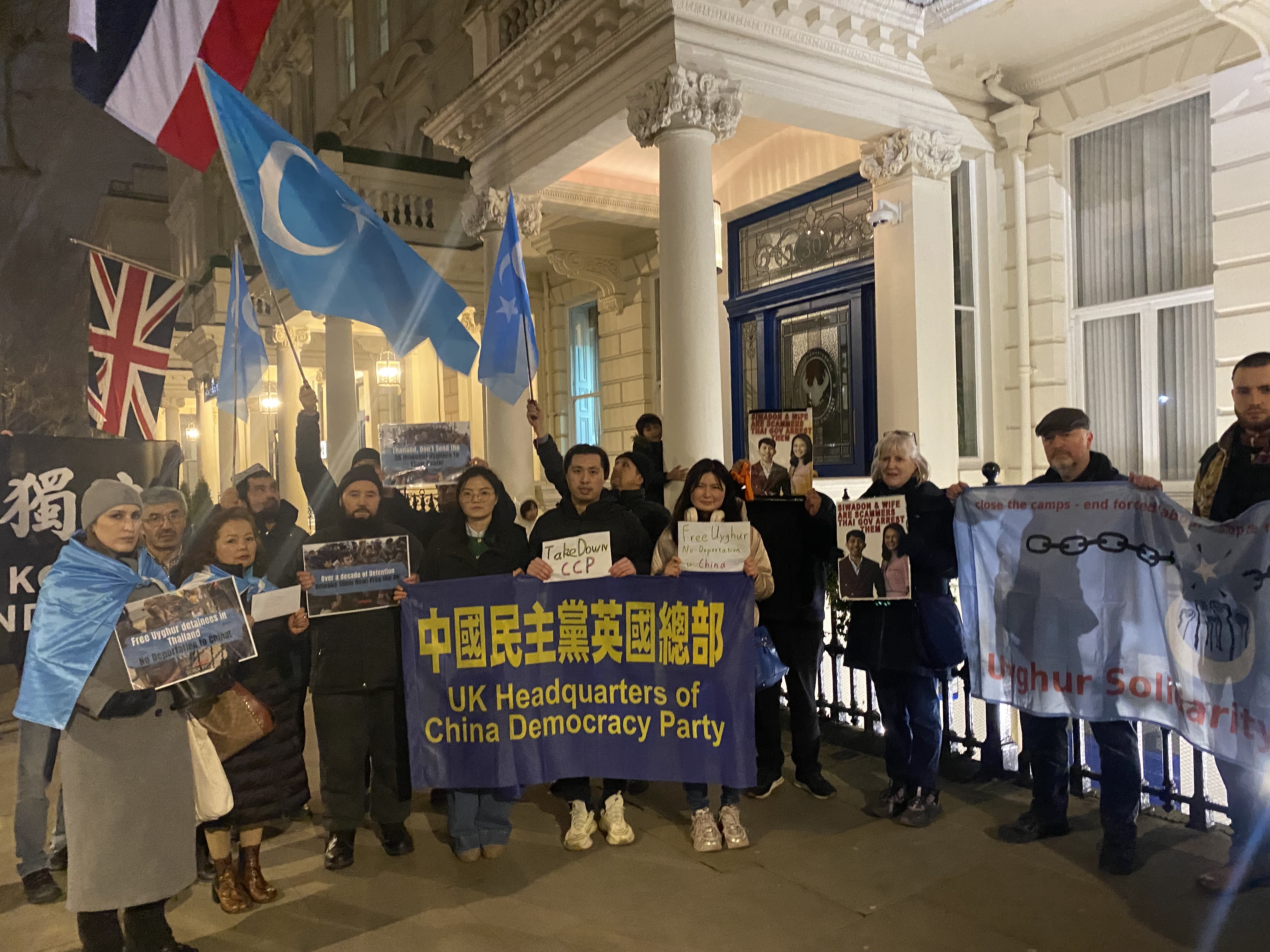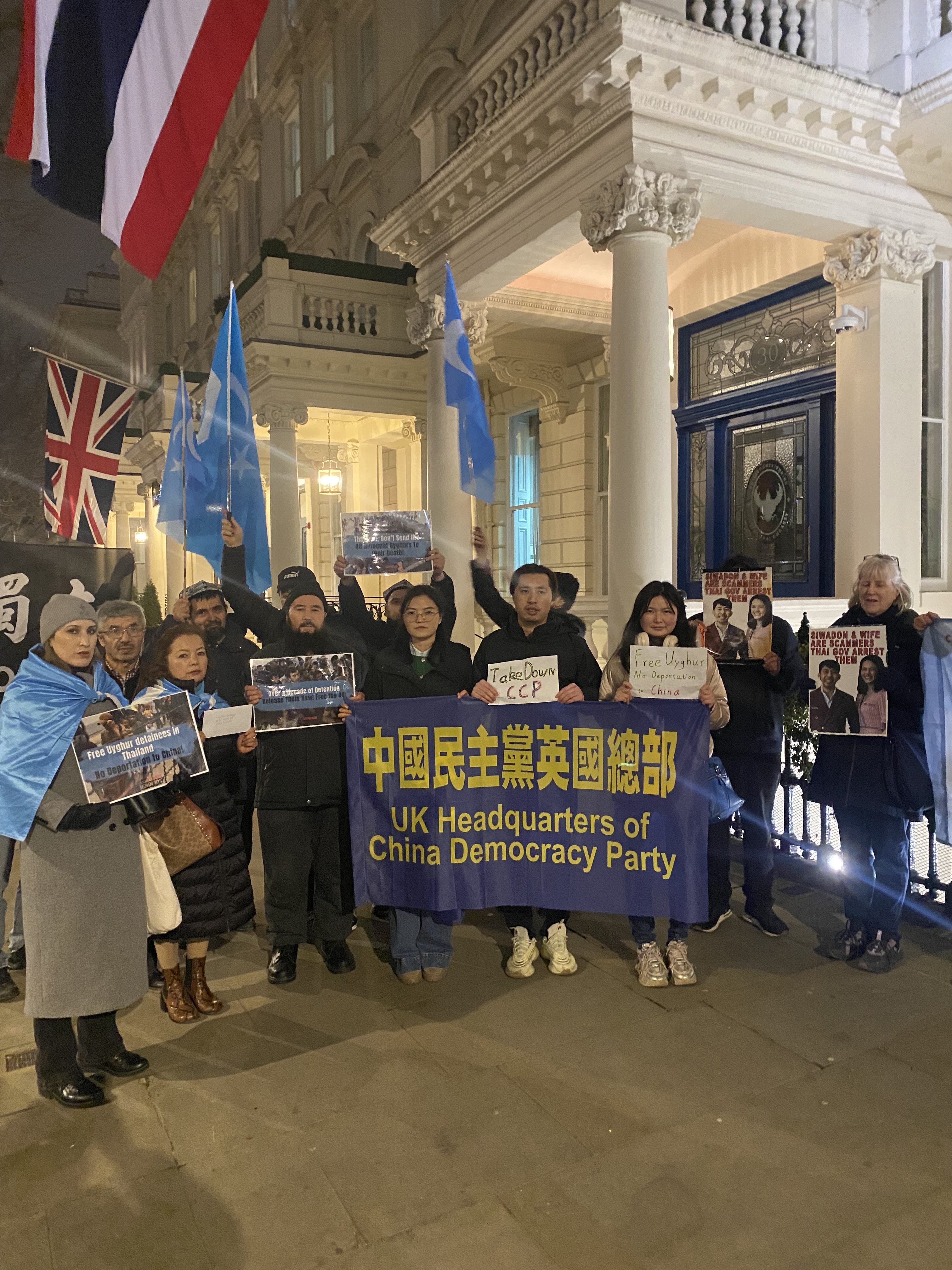 2025年1月17日,中国民主党英国总部声援维吾尔族社区代表,在伦敦泰国驻英大使馆门口发起抗议活动,呼吁泰国政府不要将48名被拘留的维吾尔族人士遣返中国,并敦促其采取行动,捍卫这些难民的基本人权。