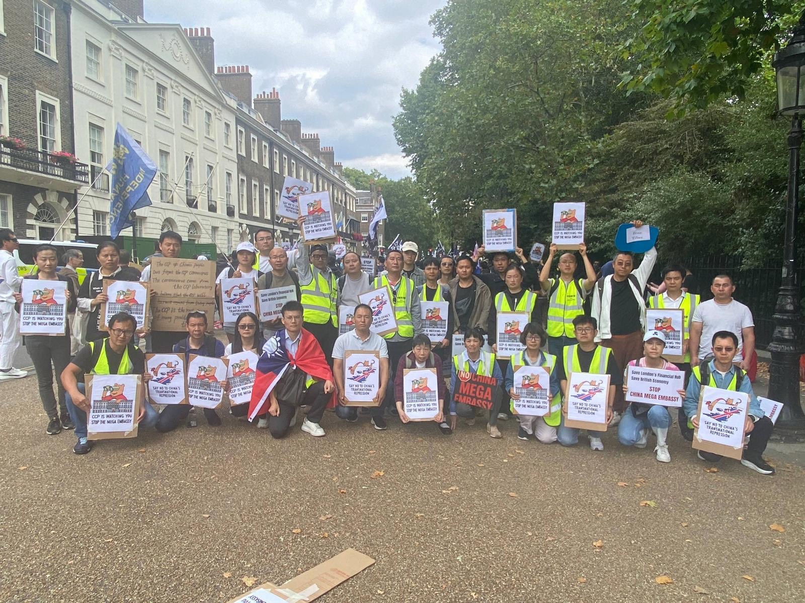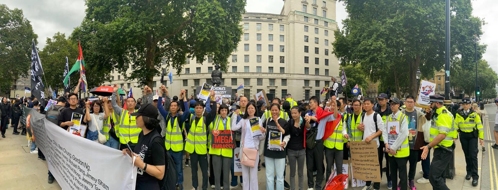 伦敦,2025年8月23日 —— 初秋的伦敦街头,响起一阵阵震耳欲聋的口号声:“打倒中共独裁!”、“不要超级大使馆!”、“捍卫自由,支持民主!”、“Free China!”、“Free Hong Kong!”、“No China mega embassy!” 来自香港、藏人、维吾尔社群与中国民主党英国总部的一千五百余名示威者汇聚一堂,以游行的方式抗议中共拟在皇家铸币厂旧址建立所谓“超级大使馆”的计划。