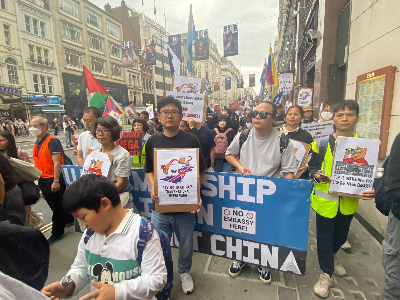 在示威队伍中,中国民主党英国总部的身影尤为鲜明。民主党队伍与香港、藏人、维吾尔等社群并肩而行,彼此旗帜交错,口号交织,形成一股强大的合力。不同语言的呼声此起彼伏,但传递的核心却一致:抵制极权,守护自由。这种跨群体的呼应,令整场游行气势更加磅礴。