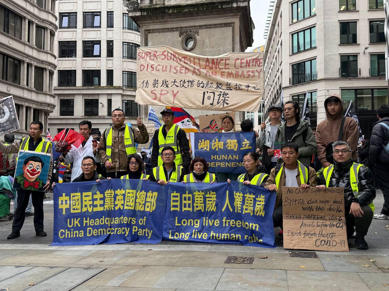 On the afternoon of 15 November 2025 at 1:30 pm, members of the UK Headquarters of China Democracy Party gathered alongside Hong Kong community groups at The Monument, marking the seventh round of protests against the construction of the so-called “China Mega Embassy” in London.