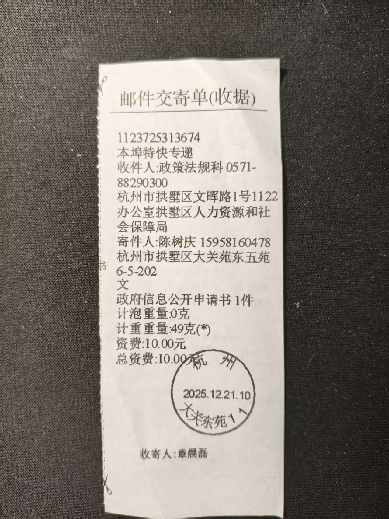 注:本《政府信息公开申请书》已于2025年12月21日寄发拱墅区人力资源和社会保障局。