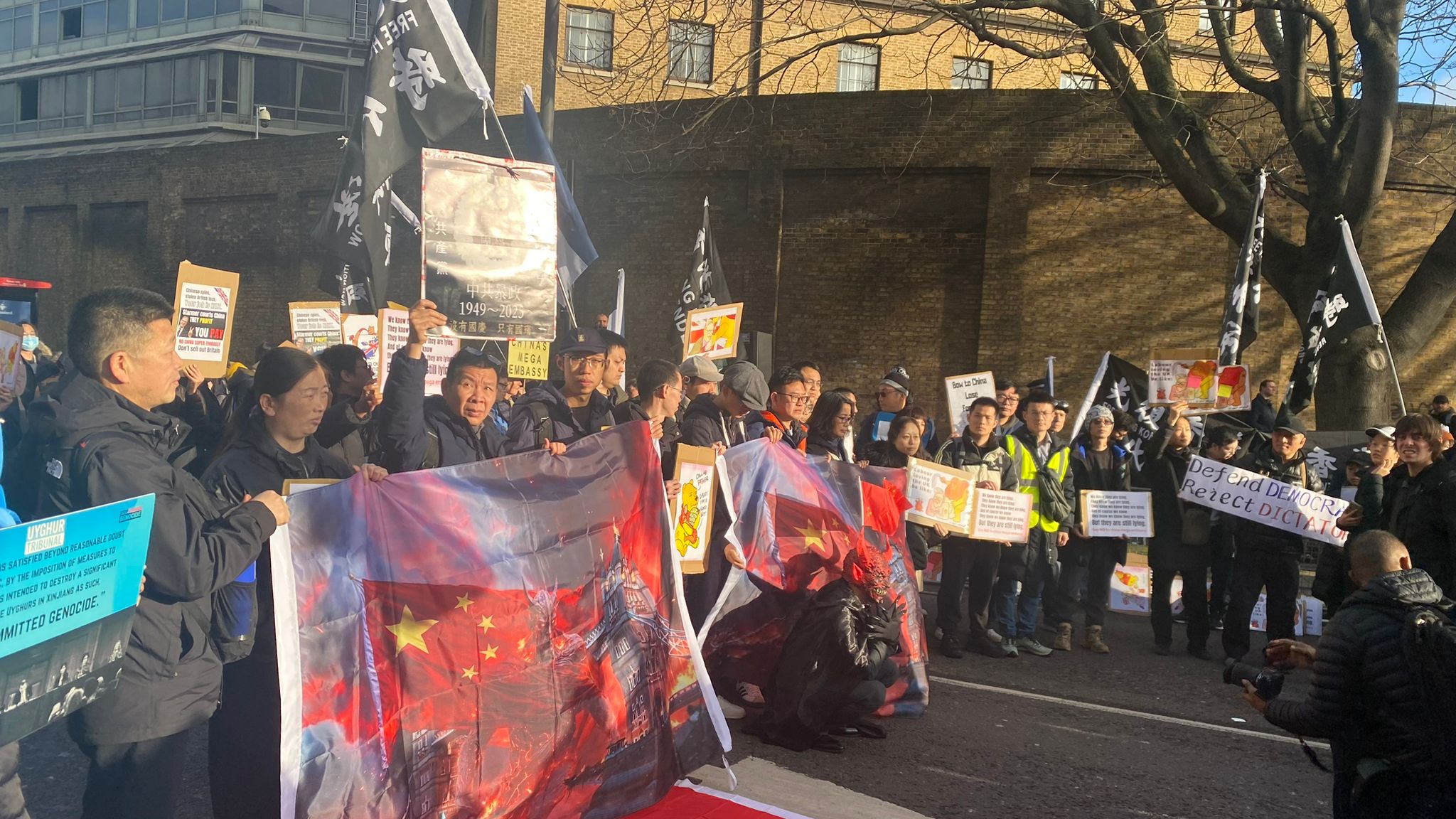 1月17日下午,伦敦铸币场旧址周边逐渐被抗议人群包围。来自中国民主党英国总部、香港民主社群、维吾尔社群、西藏社群以及多个人权组织的参与者陆续抵达,现场人群规模不断扩大。